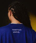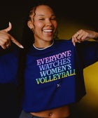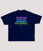 Unisex | Navy Over-sized/ Boxy Fit | Large Gradient Screen-Printed "EVERYONE WATCHES WOMEN'S VOLLEYBALL" Logo With TOGETHXR Logo On Front | TOGETHXR & LOVB Logo On Back | 1” Neck Rib | 100% cotton | 7.66 oz Weight | Double-Needle Top Stitch at Sleeve and Bottom Hem | Reactive Dyed